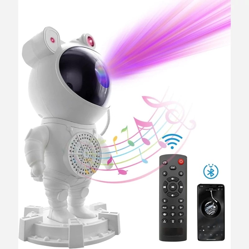 این چراغ خواب زیبا طرح فضانور هست که از طریق بلوتوس می توانید به آن وصل شوید و آهنگ مورد نظر خود پخش کنید. رقص نور فضانورد روی ماه اسپیکر دار دارای کنترل از راه دور که می توانید نور، رنگ نور، انواع مود های رقص نور، کم یا زیاد کردن آهنگ، رد کردن یا استوپ کردن آهنگ و …. را تنظیم کنید. یکی از نکات مثبت رقص نور فضانورد این هست که می توانید تنظیم کنید که فقط لیزر روشن باشد و کهکشان خاموش شود که در این صورت شما شاهد سقفی پر از ستاره هستید ، یا حتی برعکس می توانید لیزر ها را خاموش و کهکشان را روشن کنید.