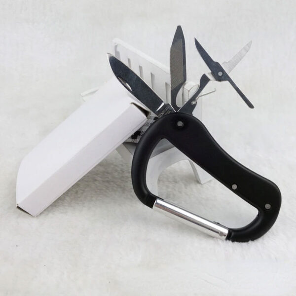 کارابین چندکاره یه گجت همهکاره و پرتابل برای کساییست که دنبال یه ابزار جمعوجور و مقاوم برای سفر، کمپینگ یا استفاده روزمرهان. این کارابین فقط یه قلاب ساده نیست؛ با قیچی، چاقو، درببازکن و سوهان، یه جعبه ابزار کوچیک رو توی خودش جا داده. طراحی تاشوش بهگونهایه که همه این ابزارها توی محفظه بدنه جمع میشن و توی حالت بسته، شبیه یه کارابین معمولی میشه. وزن سبک (حدود ۵۰-۱۰۰ گرم) و اندازه کوچیکش (تقریباً ۷-۱۰ سانتیمتر) باعث میشه بهراحتی توی جیب، کیف یا حتی بهعنوان جاکلیدی همراهتون باشه.